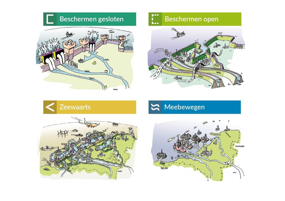 Vanuit het team van de Deltacommissaris vertelt Jos van Alphen dat er nog geen keuzes hoeven te worden gemaakt uit de scenario-richtingen van de consortia die studeren op de zeespiegelstijging: Beschermen open (zoals nu),Beschermen gesloten,  Meebewegen (open zeearmen) of Zeewaarts (ringdijk in de Noordzee).